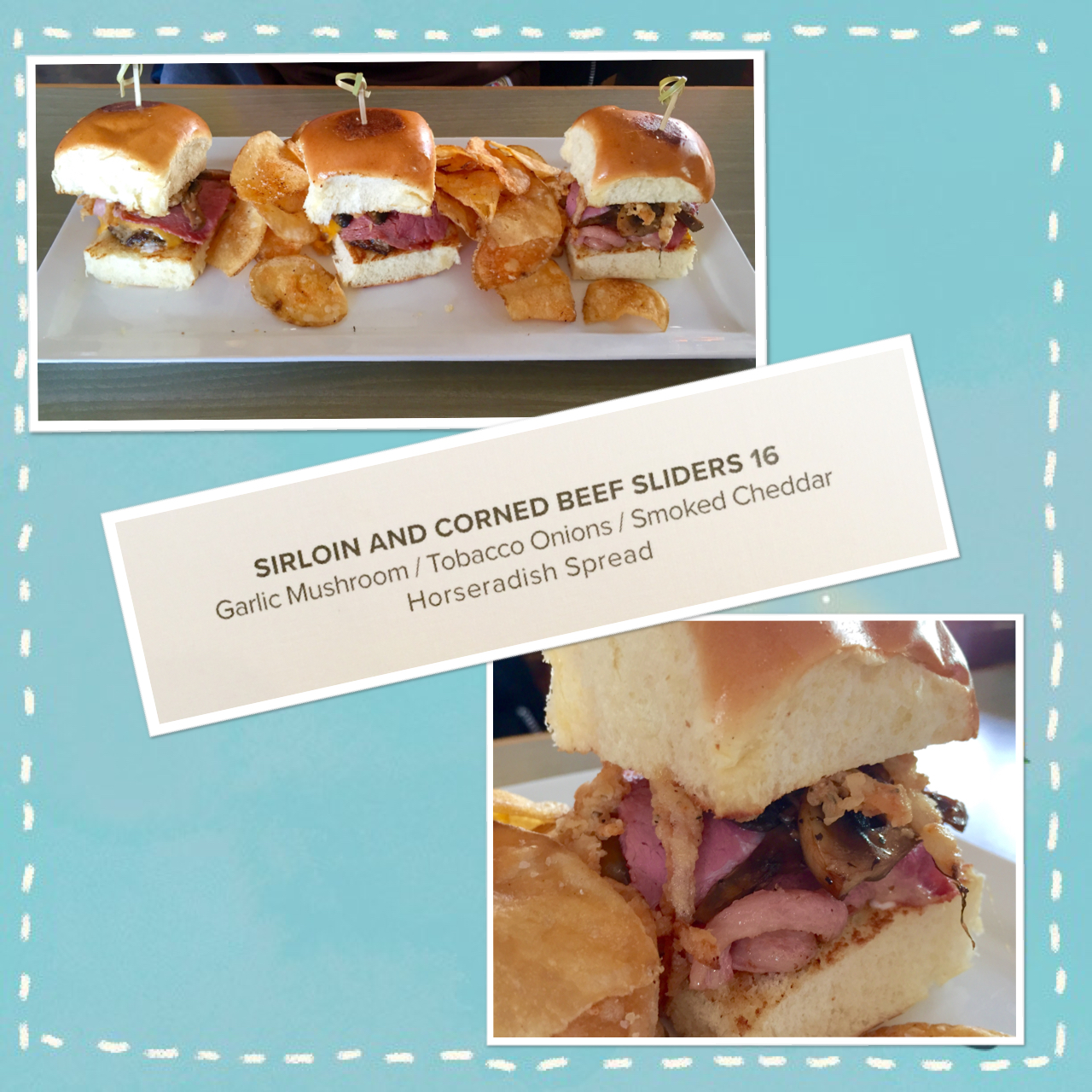Next, we decided to try the new version of the Sirloin and Corned Beef Sliders. While they had sliders on the menu in 2015, they did not include the corned beef. The other change from 2015 is that there are now THREE so the price increase (from $14.75 to $16.00) is reasonable. The sirloin continues to be cooked just right and quite tender. The addition of the corned beef really gave them a great taste – especially with the horseradish spread. Like the tenders, they are also served with the house-made potato chips.